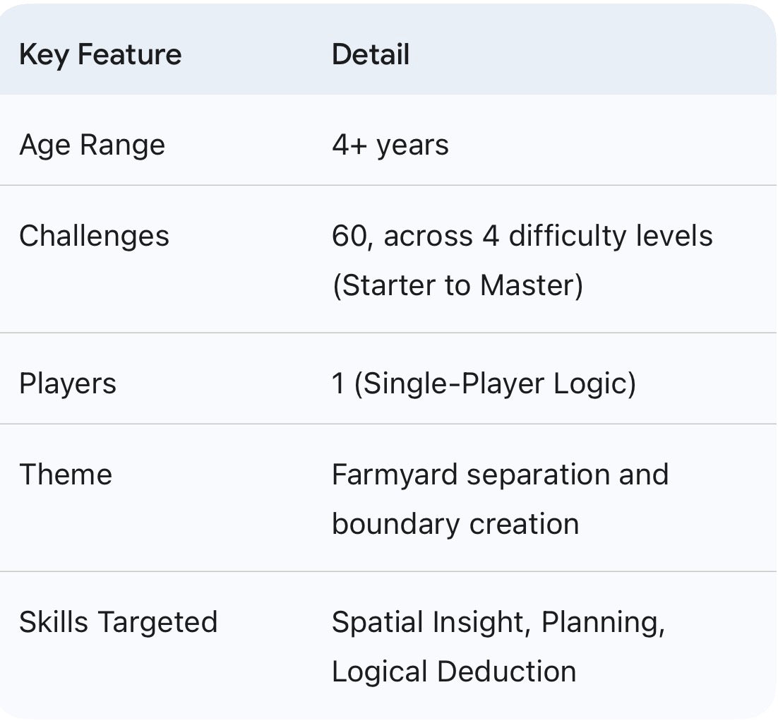 Help the farmer solve his paddock puzzle! Smart Farmer is an award-winning single-player logic game that engages young minds in essential problem-solving skills. Using just three fence pieces, children must strategically separate all the horses, cows, sheep, and pigs into their own enclosed meadows.